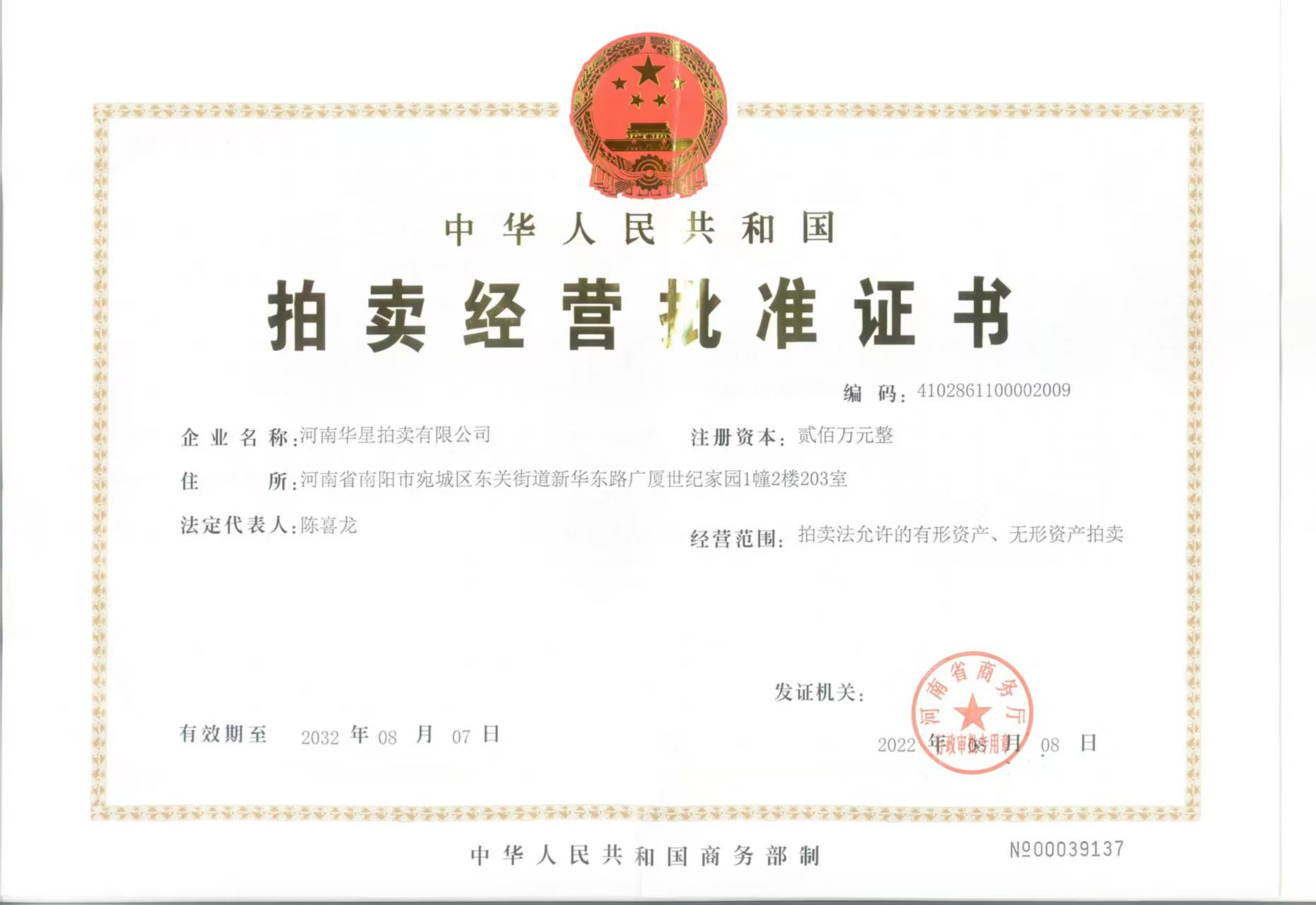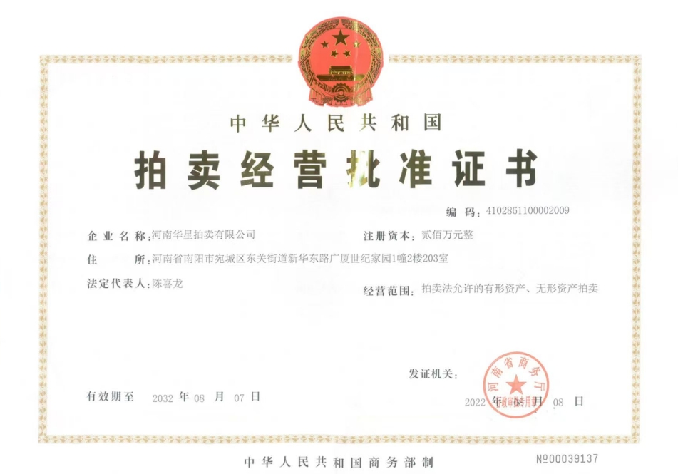 2013年7月取得南陽(yáng)市人民政府指定、河南省財(cái)政廳頒發(fā)河南省公物拍賣資格證書(shū)
