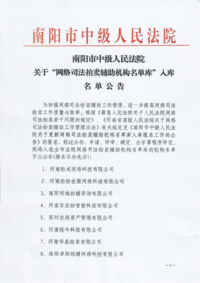2025年1月入圍南陽(yáng)市中級(jí)法院“網(wǎng)絡(luò)司法拍賣輔助機(jī)構(gòu)名單庫(kù)”